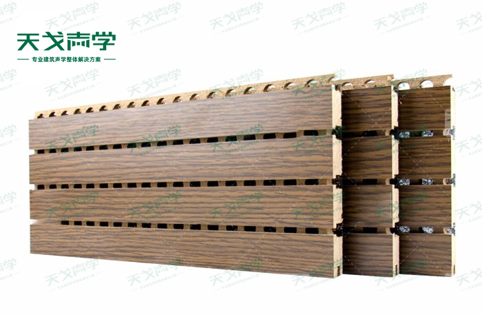 天戈玻鎂板槽木吸音板是一種在密度板的正面開槽、背面穿孔的狹縫共振吸音材料。槽木吸音板對吸聲頻譜選擇性很強,對中低頻有很好的吸聲性能。若在吸聲結構后空腔填入適量的吸聲棉可提高中、高頻吸聲效果,標準化模塊設計,采用插槽、龍骨結構,安裝簡易,常用于墻面或天花裝飾。