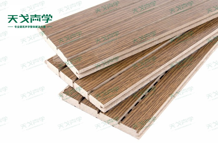 天戈木質槽條吸音板是一種在密度板的正面開槽、背面穿孔的狹縫共振吸音材料。槽木吸音板對吸聲頻譜選擇性很強,對中低頻有很好的吸聲性能。若在吸聲結構后空腔填入適量的吸聲棉可提高中、高頻吸聲效果,標準化模塊設計,采用插槽、龍骨結構,安裝簡易,常用于墻面或天花裝飾。