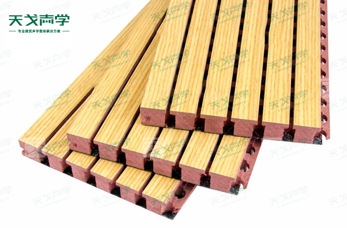天戈防火槽木吸音板是一種在密度板的正面開槽、背面穿孔的狹縫共振吸音材料。防火槽木吸音板對吸聲頻譜選擇性很強,對中低頻有很好的吸聲性能。若在吸聲結構后空腔填入適量的吸聲棉可提高中、高頻吸聲效果,標準化模塊設計,采用插槽、龍骨結構,安裝簡易,常用于墻面或天花裝飾。
