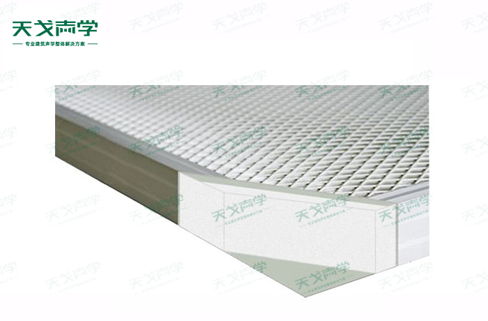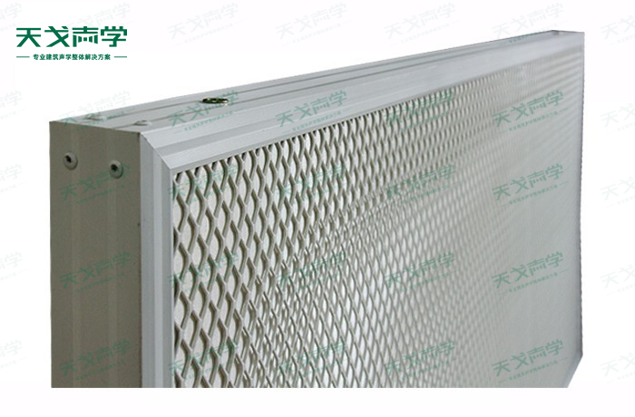 結(jié)構(gòu)——四周鋁合金框內(nèi)置歐文斯科寧吸聲棉,外包吸聲玻纖難燃/不燃吸聲布,加鋁網(wǎng)飾面構(gòu)成
