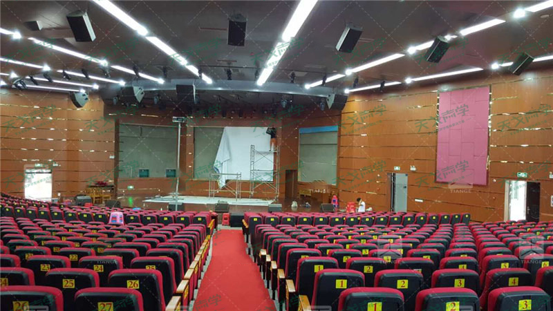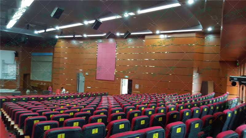 欽州二中擁有一個(gè)國際化的音樂廳,為使音樂廳達(dá)到最佳的聲學(xué)效果,避免顫動(dòng)回聲等聲缺陷的出現(xiàn),選用天戈聲學(xué)800平方米的櫻桃色的環(huán)保槽木吸音板作為場面吸音使用,親臨現(xiàn)場給人一種聽覺上的享受,聲音飽滿且清晰度高。