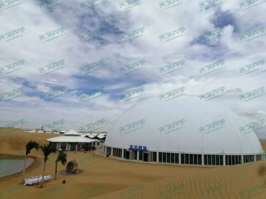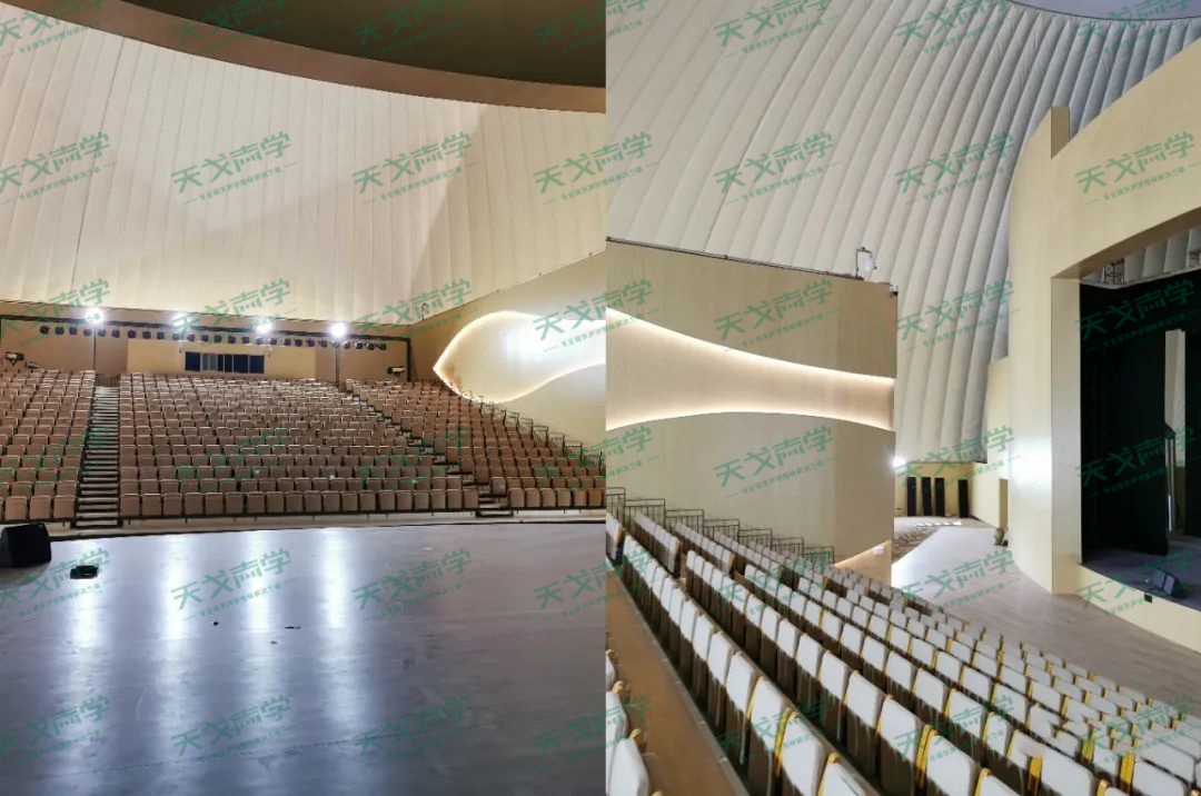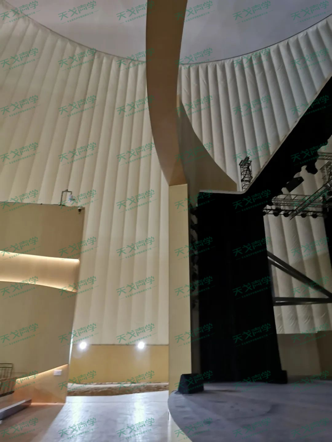 由于項(xiàng)目位于沙漠中,劇場的主體建筑工藝有些特殊,沒有實(shí)體墻,室內(nèi)是由氣模組合而成,加上沙漠中惡劣的自然環(huán)境,晝夜溫差大等因素導(dǎo)致了該項(xiàng)目的聲學(xué)裝飾施工難度巨大。這些對于天戈聲學(xué)來說是一個(gè)挑戰(zhàn)。