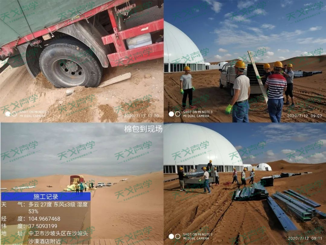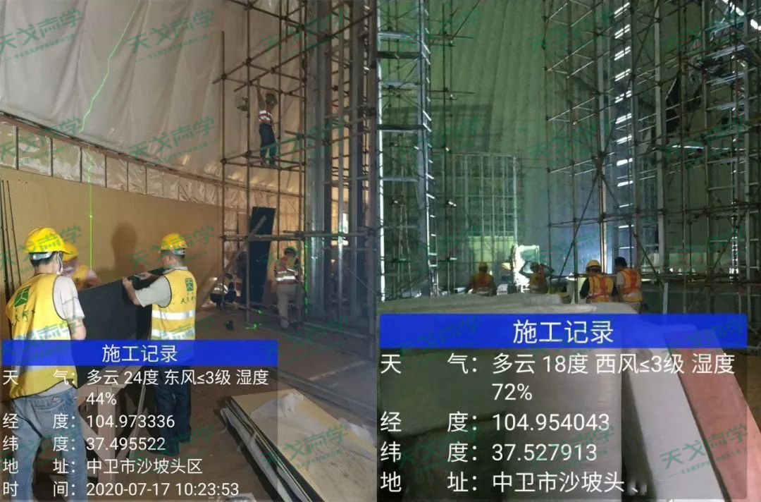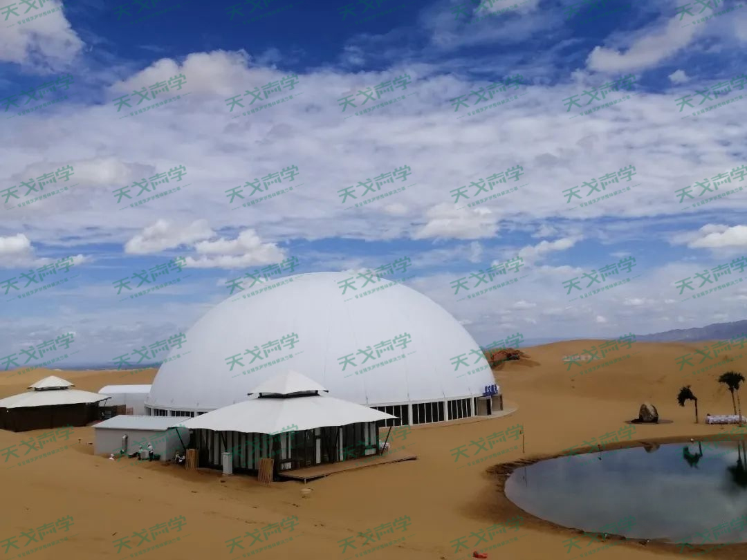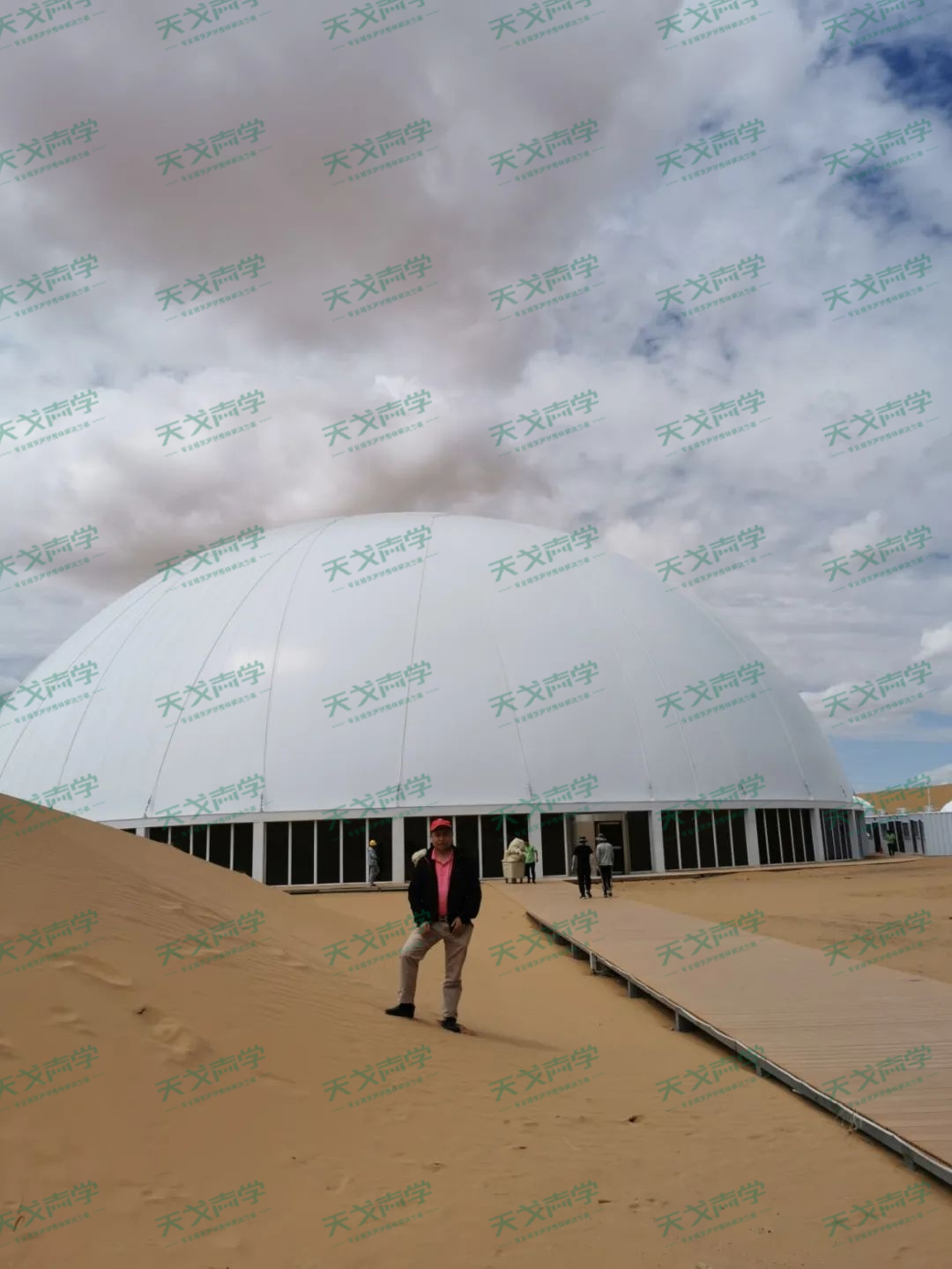 由于項(xiàng)目位于沙漠中,劇場的主體建筑工藝有些特殊,沒有實(shí)體墻,室內(nèi)是由氣模組合而成,加上沙漠中惡劣的自然環(huán)境,晝夜溫差大等因素導(dǎo)致了該項(xiàng)目的聲學(xué)裝飾施工難度巨大。這些對于天戈聲學(xué)來說是一個(gè)挑戰(zhàn)。