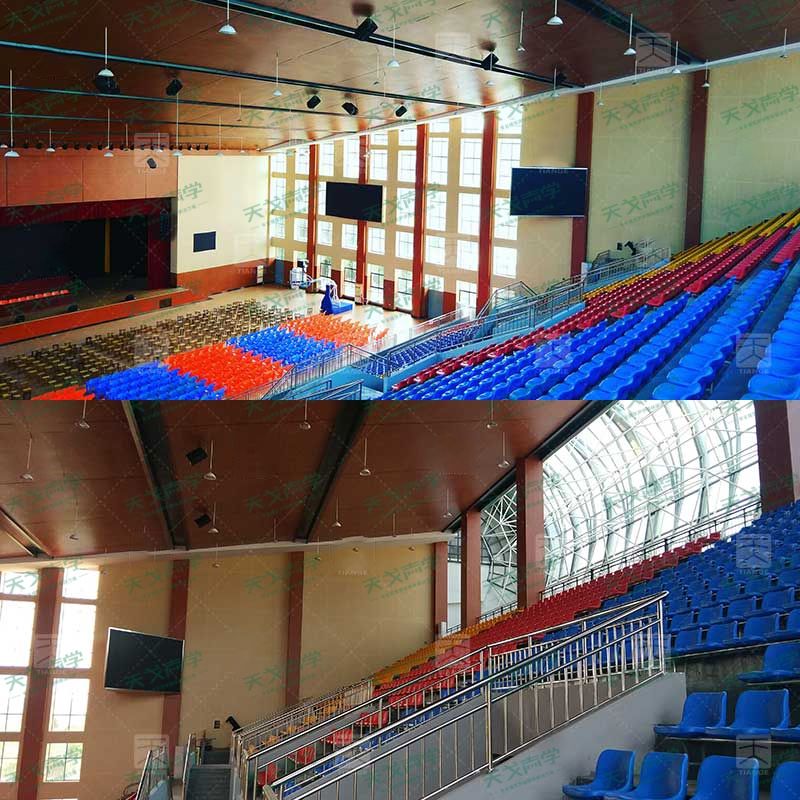 一般來(lái)說(shuō),多功能體育館建筑聲學(xué)設(shè)計(jì)的基本要求是要達(dá)到足夠的響度、滿(mǎn)意的清晰度、全場(chǎng)有比較均勻的效果以及無(wú)回聲干擾等物理缺陷,除了基本的設(shè)計(jì)之外,吸音材料的選擇也很重要。天戈聲學(xué)向校方推薦的產(chǎn)品是天戈體育館孔木吸音板。