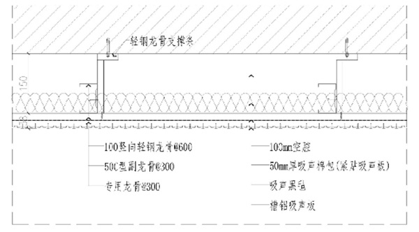 結(jié)構(gòu):50mm厚吸聲棉包+吸聲黑氈+槽鋁吸音板