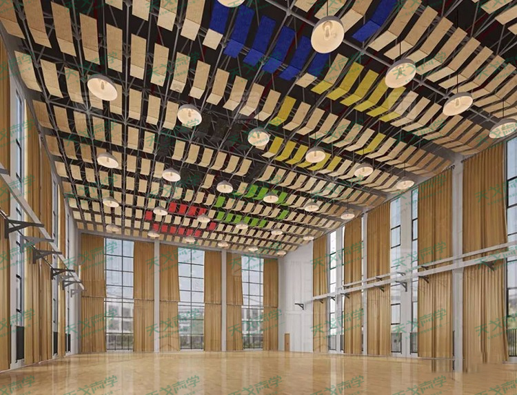 由于場館天花與地面形成平行面,極容易產生顫動回聲。因此頂棚布置吸聲性能強的材料或構造,以避免產生顫動回聲影響音響設備的正常使用。依據(jù)本體育館的原設計,充分考慮到館內音質要求,在頂部鋼結構下方布置具有防潮防火性能的寬頻吸聲體。