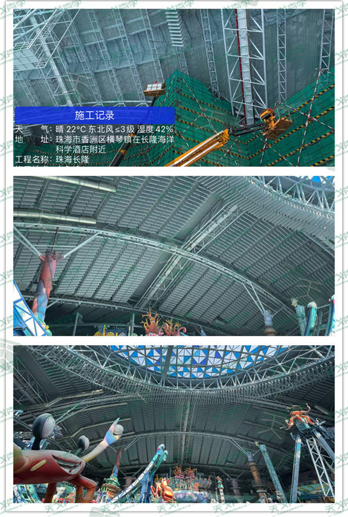 技術(shù)難點(diǎn):大魚館最高度達(dá)到48米,安裝困難,天戈裝飾團(tuán)隊(duì)研究決定使用長避車施工。兒童場(chǎng)館有很多兒童設(shè)施,活動(dòng)困難,天戈裝飾團(tuán)隊(duì)研究決定采用增加人員行走人架的安裝方式。長隆的施工要求比較高,所有配件的安裝和間距都要達(dá)到國家的標(biāo)準(zhǔn),但專業(yè)的天戈聲學(xué)裝飾團(tuán)隊(duì)按照標(biāo)準(zhǔn)一一完成。項(xiàng)目所有鋼材必須防銹、抗氧化。迎賓入口廳堂,高度32米左右,中心區(qū)域有一個(gè)八爪型的裝飾造型,導(dǎo)致施工難度增加,天戈聲學(xué)裝飾團(tuán)隊(duì)研究決定使用的安裝方式是長避車+人工支架行走的安裝方式。面對(duì)多個(gè)工程技術(shù)難題,天戈聲學(xué)裝飾團(tuán)隊(duì)都逐一解決,因?yàn)槲覀儓?jiān)信沒有解決不了的難題,不管多大的問題,我們都會(huì)磕到底。
